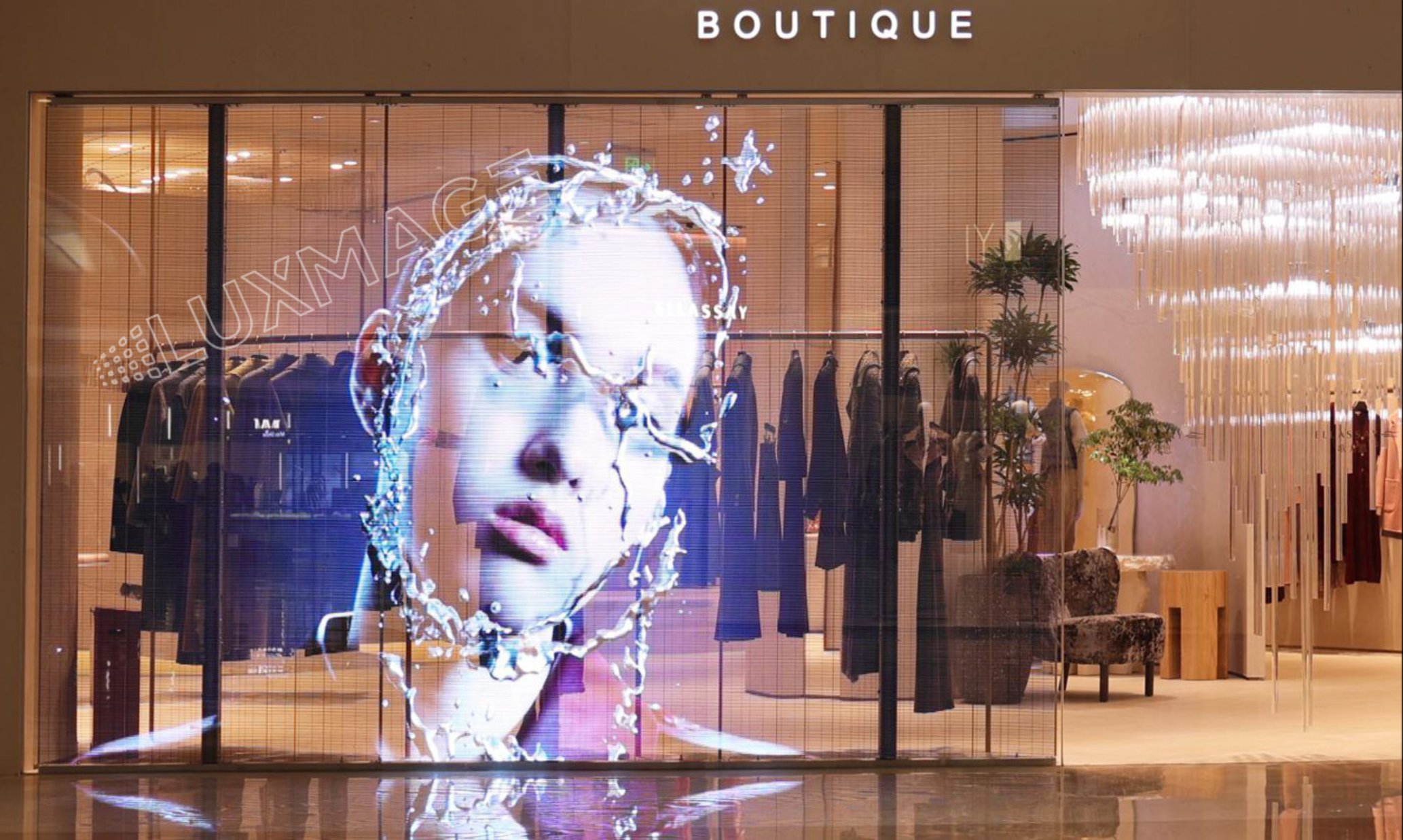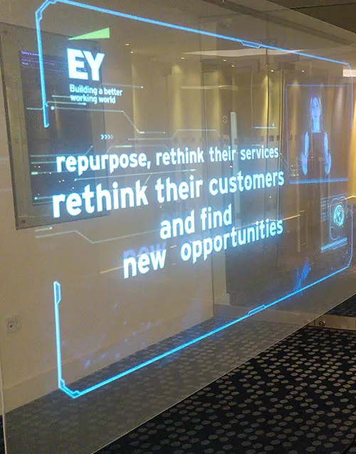 A transparent LED screen is a display mounted on glass that shows dynamic content while maintaining a high level of transparency, allowing light to pass through and people to see through the window without obstruction.